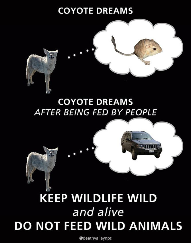 Der NPS bittet die Nationalparkbesucher, keine Koyoten im Death Valley NP zu füttern. Nachdem sie von Menschen aus Autos heraus gefüttert wurden, sehen Kojoten Fahrzeuge als "Futterquelle" an und gehen auf die Fahrbahn , um sie zu stoppen - was für den Besucher oder den Kojoten sehr gefährlich ist!