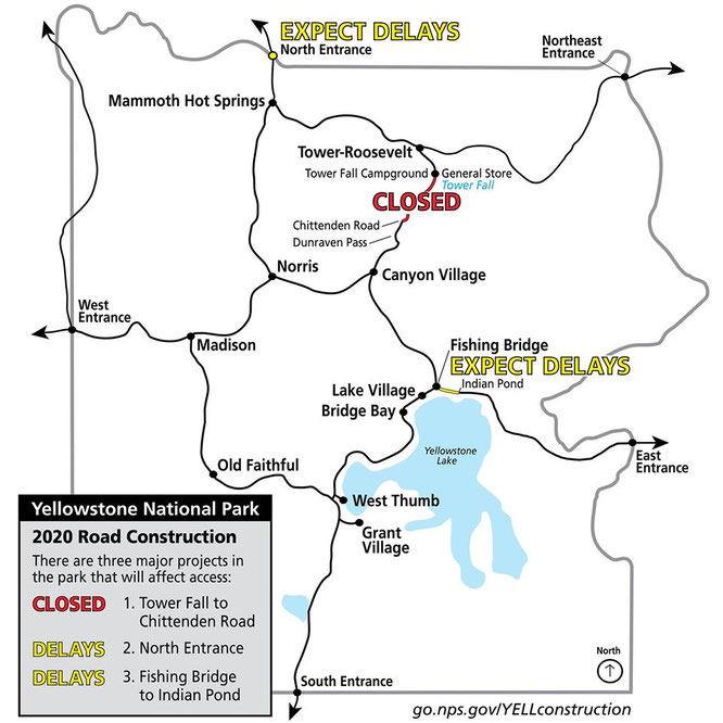 Im Yellowstone NP wird es in dieser Saison zu Verkehrsbehinderungen kommen. So soll die Parkstraße zwischen Tower Fall und Chittenden Road bis Mai 2022 wg, Bauarbeiten vollständig gesperrt sein. Auch am Nordeingang sowie zwischen der Fishing Bridge und Indian Pond kann es zu Behinderungen kommen. Aktuelle Informationen auf der Homepage.