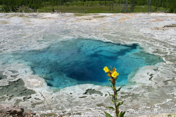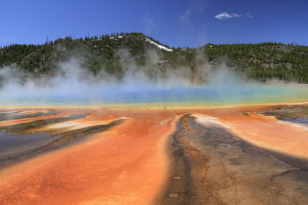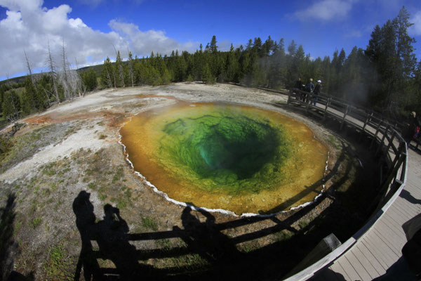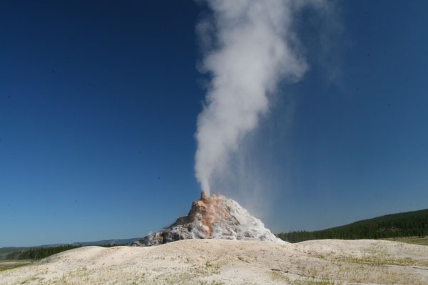 Weite Teile des Parks liege in einer vor über 600.000 Jahren entstandenen Caldera eines mächtigen Vulkans. Unter der Oberfläche, in der etwa 8 km tiefer liegenden Magmakammer brodelt es gewaltig. Daraus resultieren die etwa 300 Geysire, Fumarolen, Schlammtöpfe und heißen Quellen. Hier ist immer was los. So spuckt der bekannteste Geysir, der Old Faithful, alle 60 bis 90 Minuten zur Freude der Touristen, riesige Wasserfontänen in die Luft (siehe Bild oben). Die vielen Eindrücke sind einfach überwältigend.