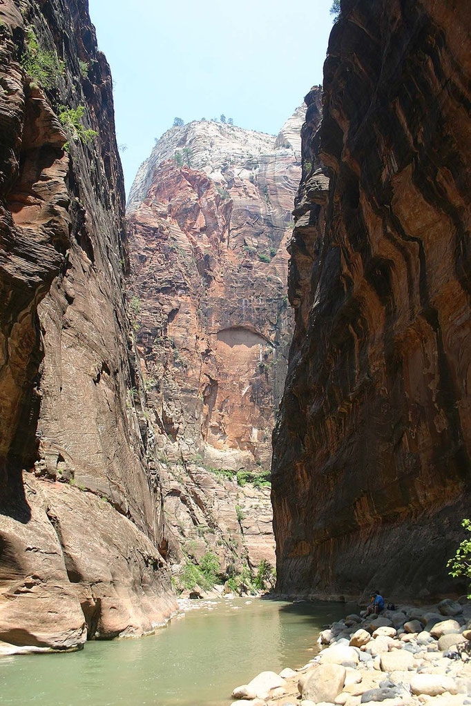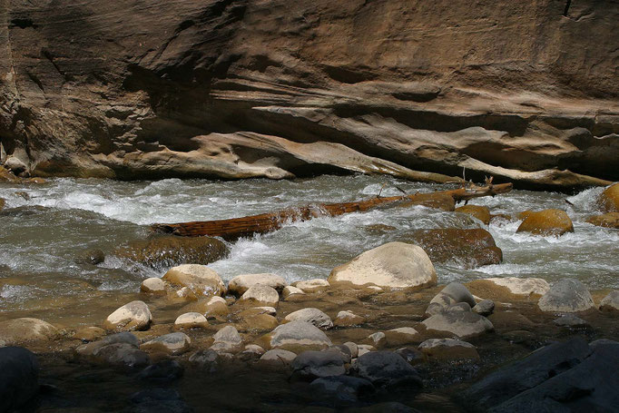 Etwas ganz Besonderes ist eine Wanderung durch die Zion Narrows, da ein Großteil des Weges durch das Flussbett des Virgin Rivers führt. Je nach Wasserstand bewegt man sich watend, gehend oder sogar schwimmend voran (Foto rechts unten). Voraus­setzung für den unvergesslichen Trip sind entsprechendes Wetter, die richtige (wasserfeste) Ausrüstung und die vorherige Absprache mit den Park Rangern. Ein Wanderstock und festes Schuhwerk sind unbedingt empfehlenswert und beugen Stürzen, auf mit Algen bewachsenen Steinen, in der starken Strömung vor. Auch Wäsche zum Wechseln ist sinnvoll, denn auch im Sommer ist das Wasser recht kühl und nur wenig Son­nen­licht gelangt bis zur Talsohle. Auch wenn man nur einen Bruchteil der 26 km bis zur Chamberlain Ranch schafft und vorzeitig zurückkehrt, ist die Wanderung durch die Narrows ein unvergessliches Abenteuer.